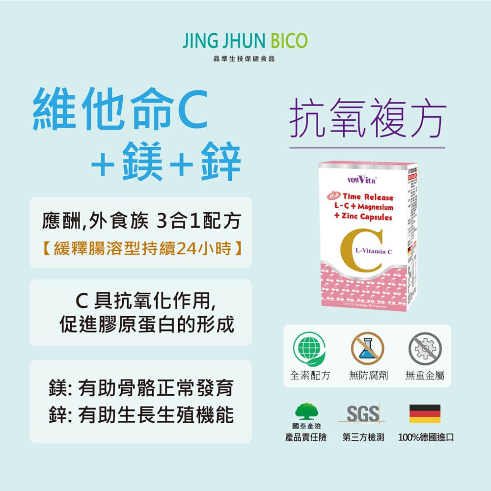 【諾維他®】德國頂級左旋維他命C+鎂+鋅 膠囊 【緩釋型24hr】 Time Release L-C+Magnesium+Zinc Capsules(全素可食) (30粒裝/盒)