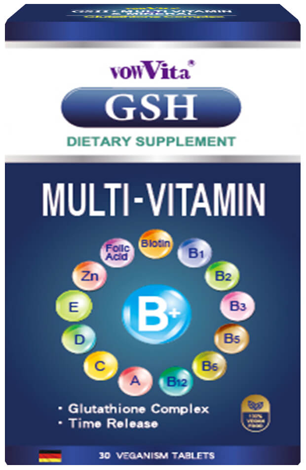 A:本產品結合德國圓酵母來源的穀胱甘肽(英文 Glutathione,簡稱GSH),並添加多種維他命(Vitamins)與礦物質(Minerals),包括:維生素A、C、D、E、B群(B1、B2、B6、B12、葉酸、菸鹼素、泛酸、生物素、膽素與肌醇等)以及鋅、鈣、鐵、碘等多種營養素(Nutrients)。