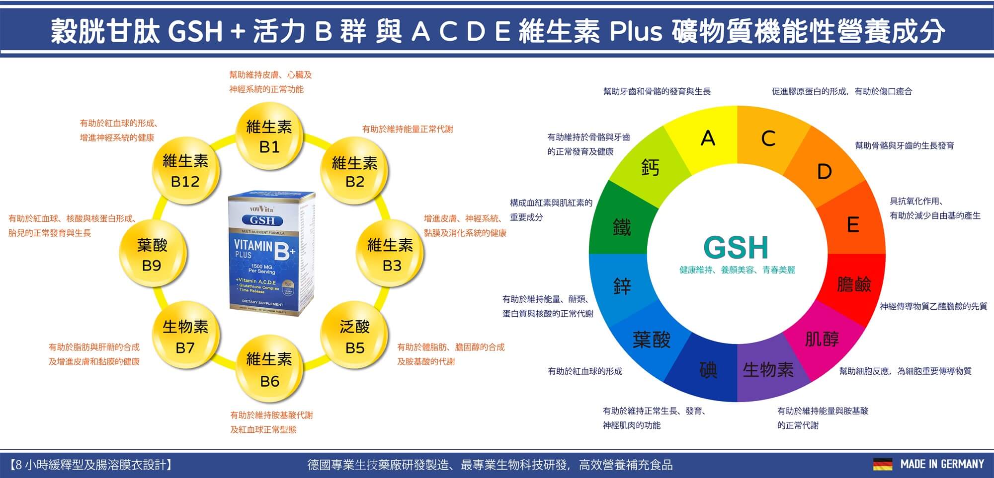 A:全新進化來自德國嚴選品質,穀胱甘肽GSH+活力綜合維他命設計配方,採用緩釋腸溶型特殊膜衣加強保護,讓膜衣營養錠在進入人體後不受胃酸破壞,能完整送達腸道吸收;緩釋膜衣的作用,可在腸道發揮作用持續8小時,幫助你長效營養補充吸收作用維持時間
