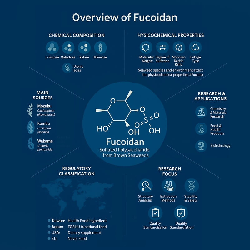 Fucoidan 的分子結構在不同藻種、季節、海域與萃取條件下可能不同,其化學特性包括:分子量、硫酸化程度、單醣比例與鍵結型態。