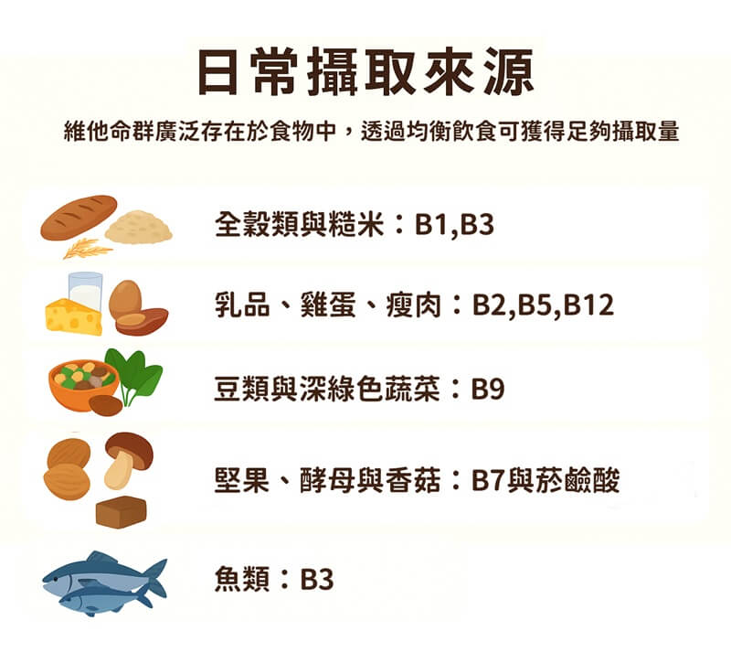 維他命B群廣泛存在於天然食物中,透過均衡飲食即可獲得足夠攝取量。