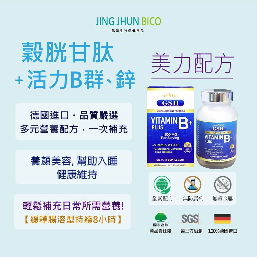 A:『德國進口 穀胱甘肽GSH+維生素活力B群+鋅 膜衣錠』,嚴選德國專業藥廠研發製造,可完整補充人體必需的關鍵維生素,維生素的種類包括有水溶性維生素(B1、B2、B3、B5、B6、B7、B9、B12和C)和脂溶性維生素(A、D、E),並含有多種礦物質與機能性營養素成分(鋅、鈣、鐵、銅、錳、碘、菸鹼醯胺、膽鹼、葉酸、卵磷脂......)。獨家配方設計:緩釋B群膜衣錠持續8小時作用時間,另特別添加由天然圓酵母發酵的穀胱甘肽GSH,符合每日營養補給需求,可協助維持健康與活力。